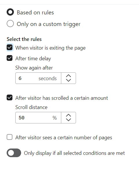 - Problems with targeting pop-ups. Very often, they show up too fast or too late, or on the wrong pages. We recommend using the following targeting settings: