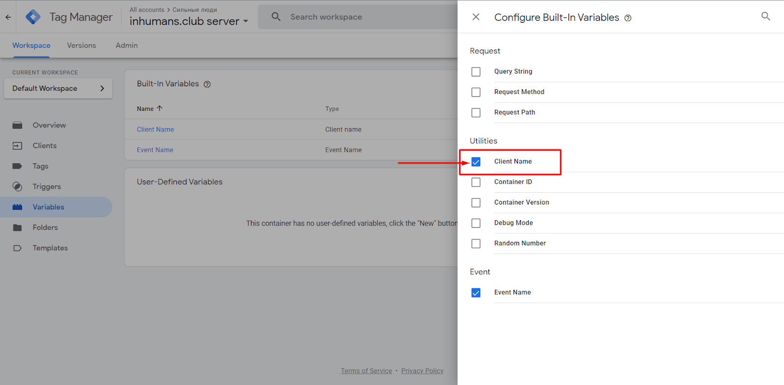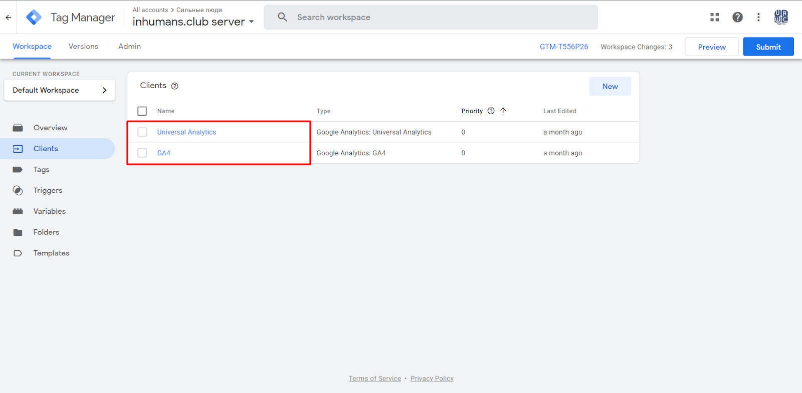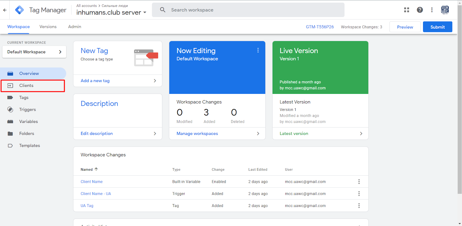 If you go to the Clients section in your GTM account, you will already see two pre-created Clients, so there is no need to create a new Client right here because you are already using it.