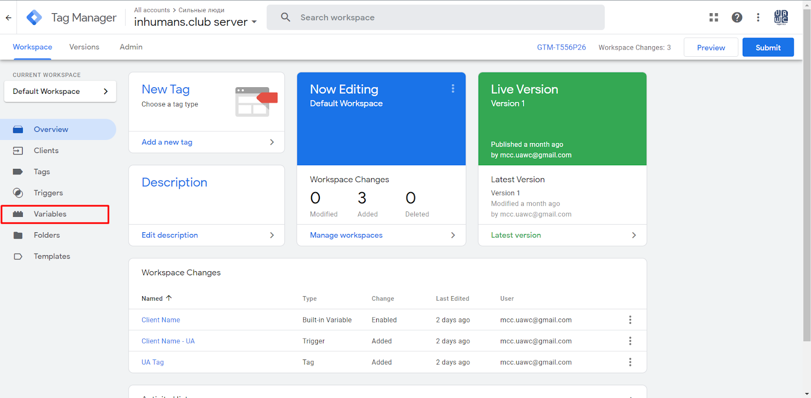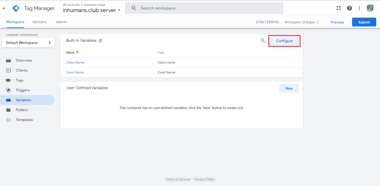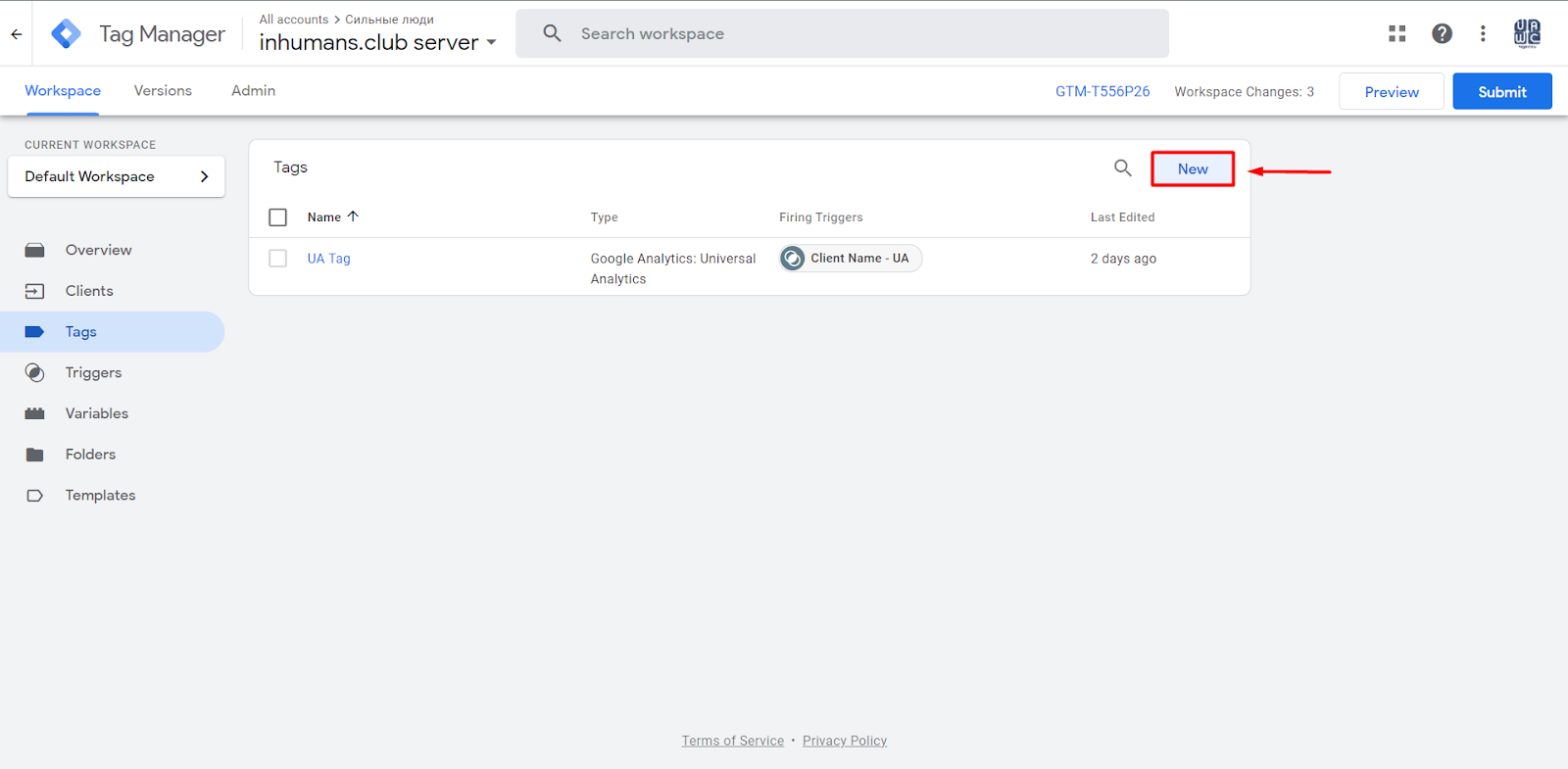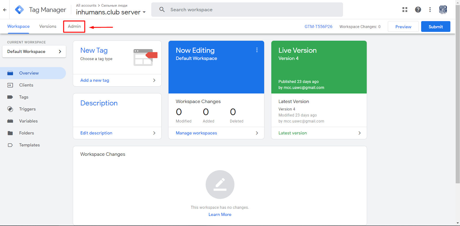If you go to the Clients section in your GTM account, you will already see two pre-created Clients, so there is no need to create a new Client right here because you are already using it.