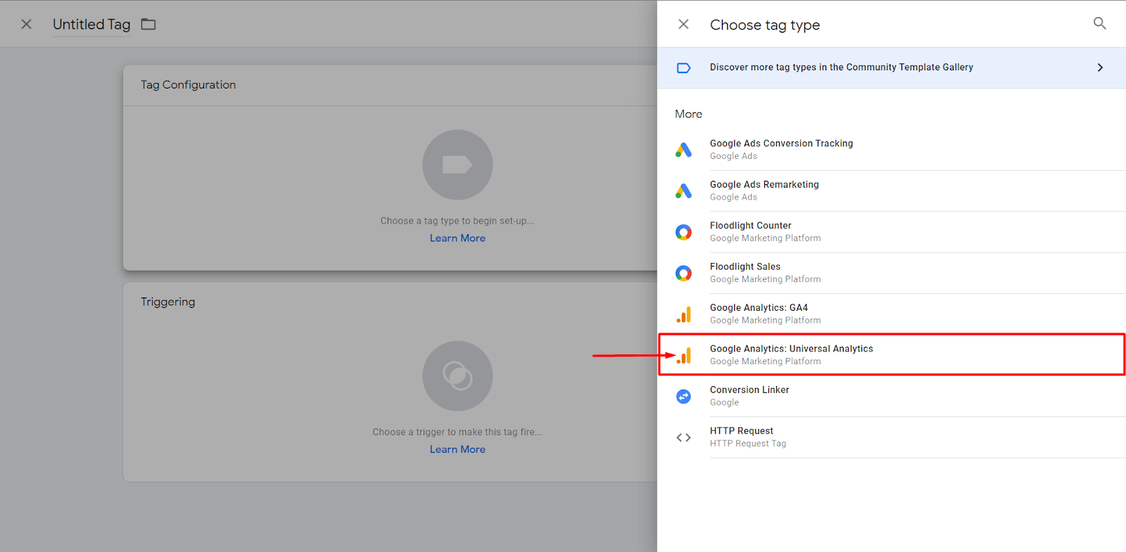 Firstly, in Tag Configuration, our type of Google Analytics must be chosen, which in my case is Universal Analytics.