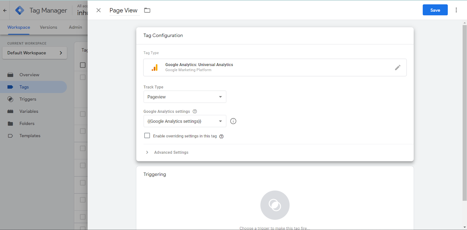 For example, I have created a “Page View” Tag which will “fire” when someone is looking at the Website.