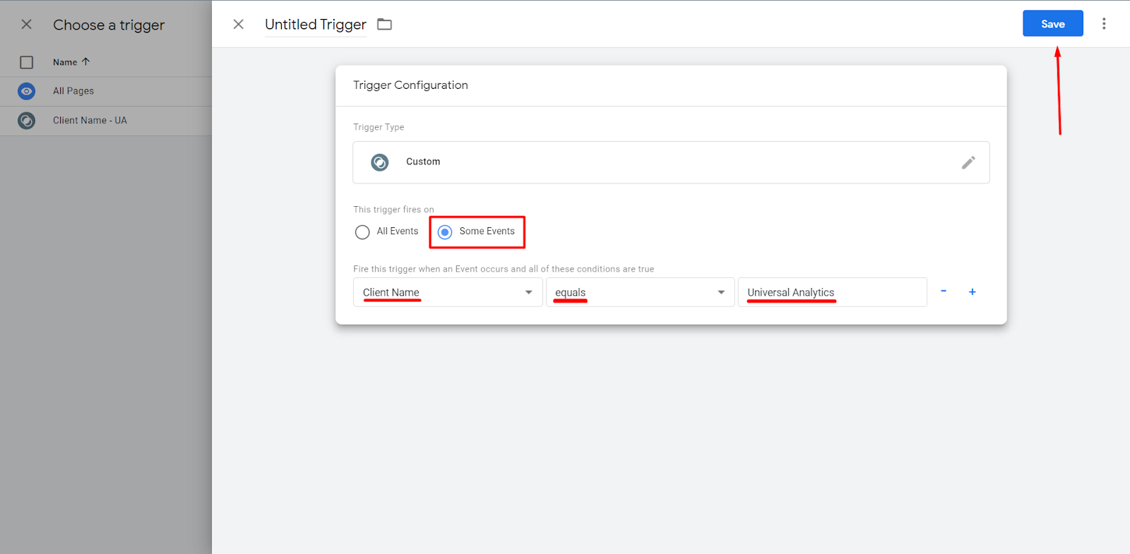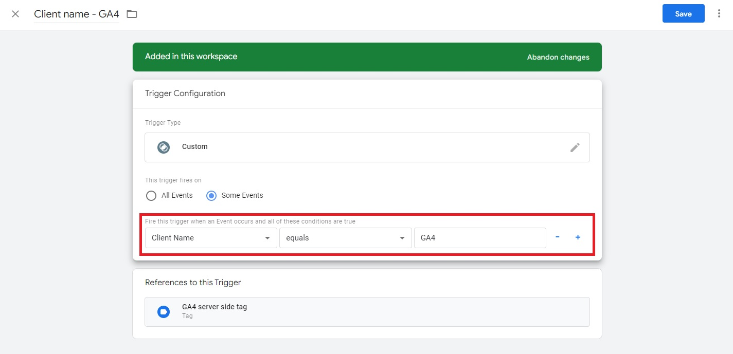 The trigger of this tag will also be similar to that of Universal Analytics except for the firing conditions where Client Name will be GA4.
