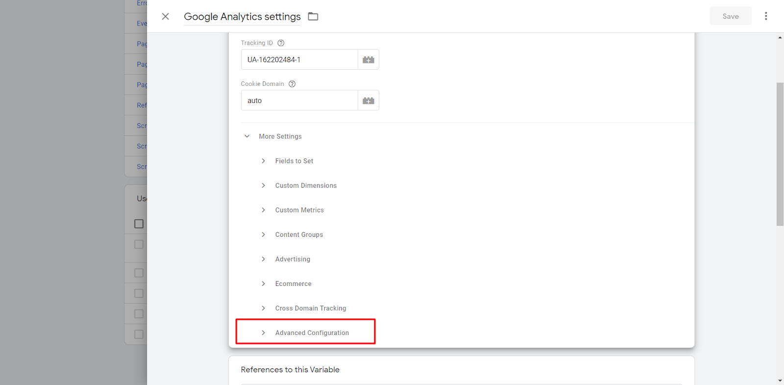 Below, in “Google Analytics” Settings we should choose the main “Variable”: Google Analytics Settings.