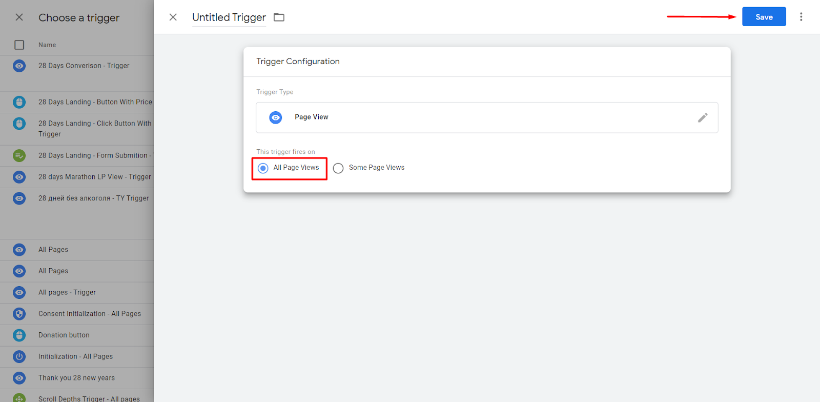 You can either choose that this “Page View” Trigger will “Fire” on all Website’s Pages or only on some pages. In our example, this is set up for All Website Pages.