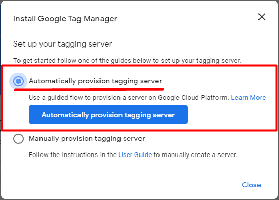 After you choose the guide, you must click on the “Automatically provision tagging server” button.