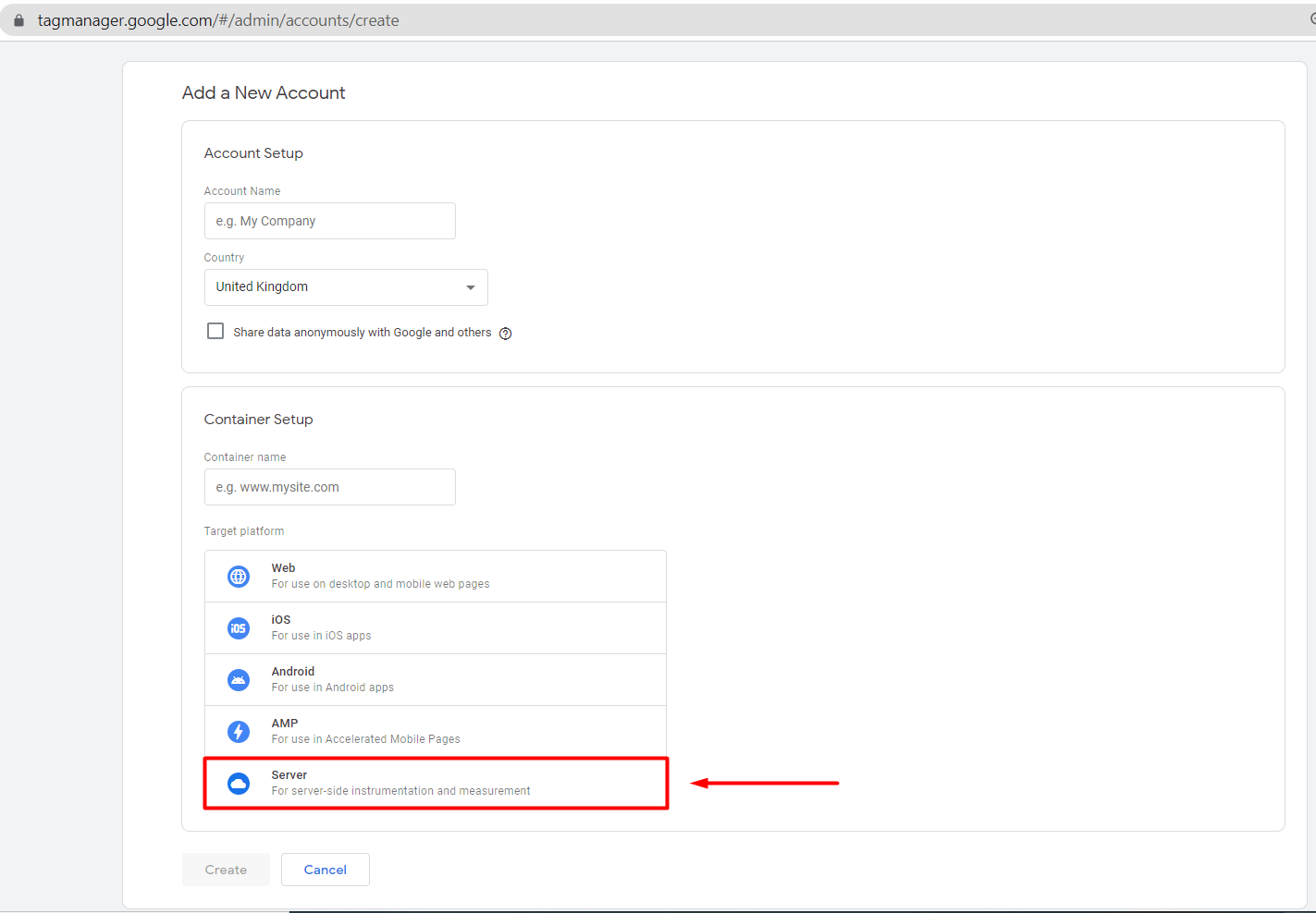 When you create an account, you need to host it somewhere and in this case (see screenshot above) it can be hosted on the Google Cloud Platform. Therefore, you should keep using the automatic provision tagging server.