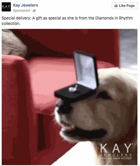 Your ad should not only tell your customers to purchase your product but why they should purchase it. Kay tells us the importance or value attached to the necklace by showing us how happy the lady was to have received the necklace. There's also another cheat code to drive your emotions, the dog.