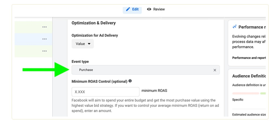 You can also optimize for Purchase events if you apply the Catalog Sales objective. At the level of the advertisement set, you should configure the Optimization for Ad Delivery as either Value or Conversion Events. The social network will automatically choose Purchase as your event type.