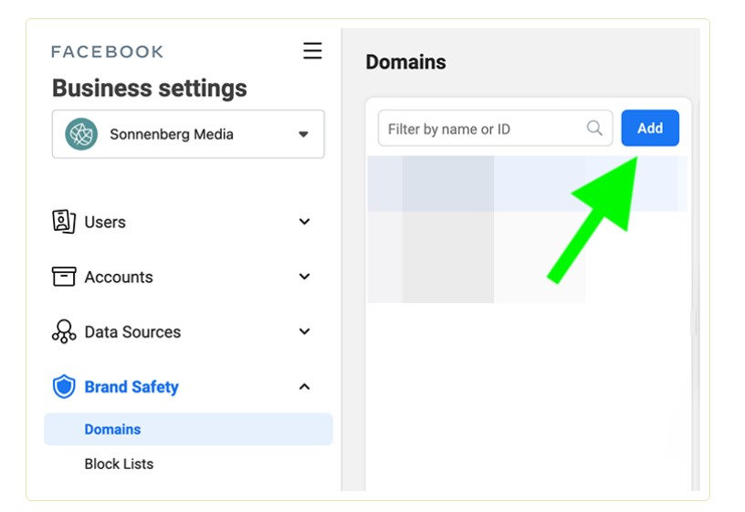 Next, you need to verify your domain to improve the level of efficiency of the Aggregated Events Measurement tool. First, you need to go to Business Settings and enter the Brand Safety drop-down menu. After that, choose Domains and click on the Add button in the right-up corner.