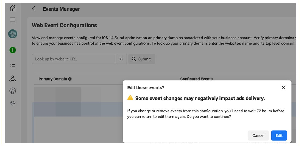 If you want to reconfigure web events, you need to go back to Aggregated Event Measurement and choose your domain. Here, you can add and delete events or replace them in the order you want. To validate your settings, just click on the Apply button.