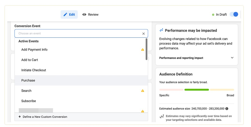 For instance, you can optimize for a middle-of-funnel event like Add to Cart to create a remarketing audience. Then you can aim to build a conversion campaign that retargets involved prospects and optimizes for Purchase events.