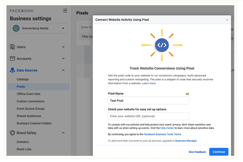 To provide events manager setup, you initially need to set up Facebook Pixel for your website. Next, you need to go to Business Manager and open Business Settings. After that, select Pixels under the Data Sources drop-down menu.