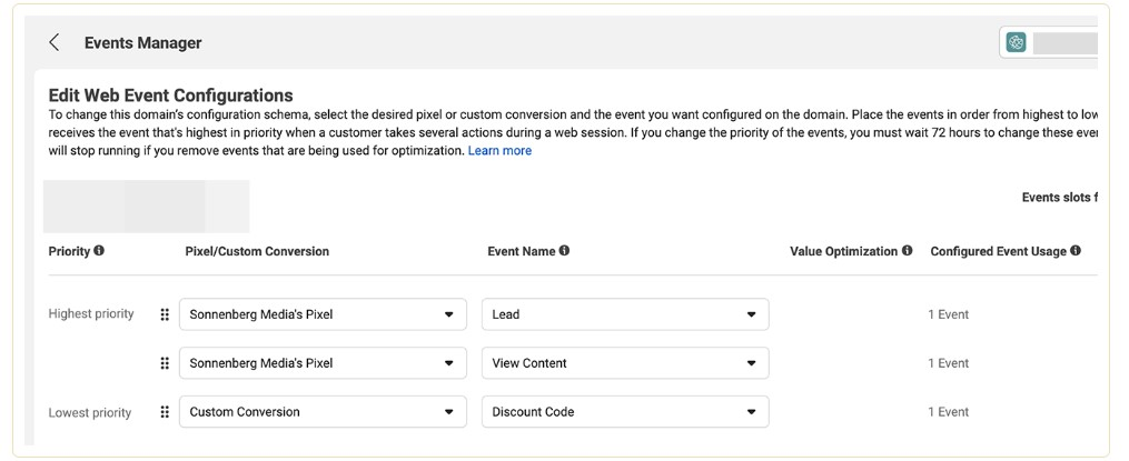 The Events Manager tool allows companies to build a big-picture view of their conversion events. By choosing events according to priority, you practically inform the tool which conversions are the most important for your business and how to optimize your ads settings. For instance, if the first priority for your business is generating leads, then set leads as your highest-priority event and set up other conversions that can benefit your company and campaign lower on the list.
