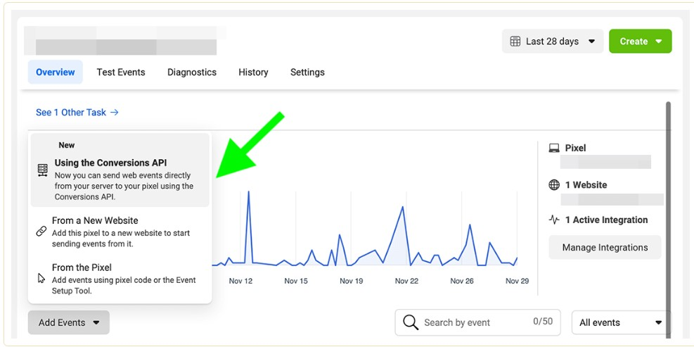 To set up Conversion API, find Events Manager and click the Add Events button.