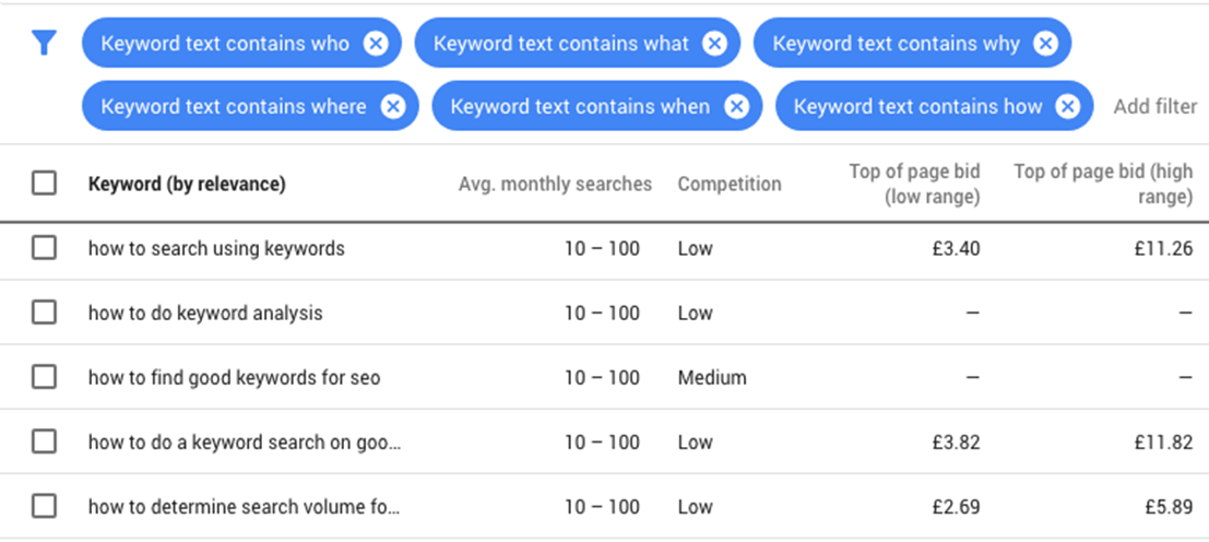 You will not need extra tools – the keyword planner can meet this goal. Start with: Filter -> Keyword text -> contains -> enter: who, what, when, where, how.