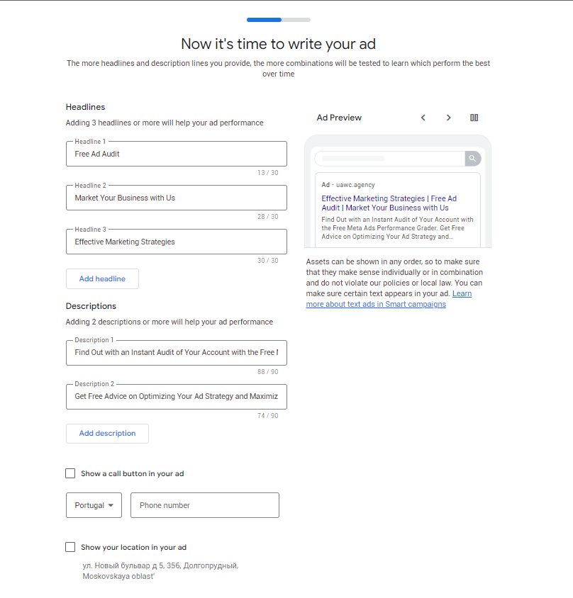 Write your ad copy, including headlines and descriptions. You can create multiple ad copies and attach different final URLs to each.