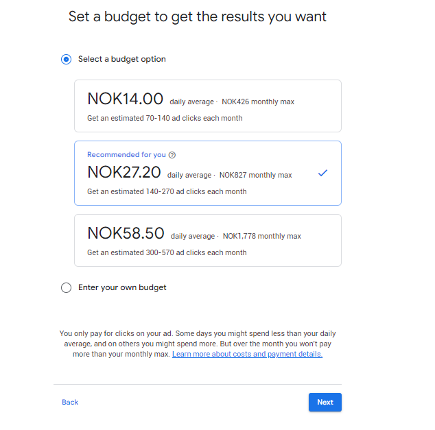 Set your budget based on Google's suggestions or your own calculations. You can adjust it later depending on your campaign's performance.