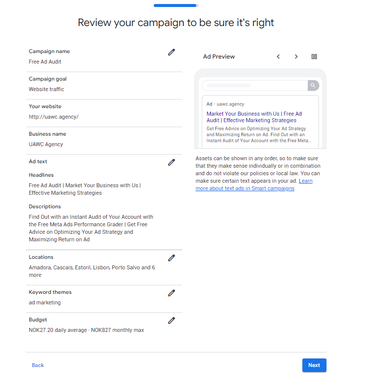 Before launching your campaign review the summary of your campaign settings. This is your last chance to make any adjustments. Double-check all details to ensure they align with your e-commerce goals.