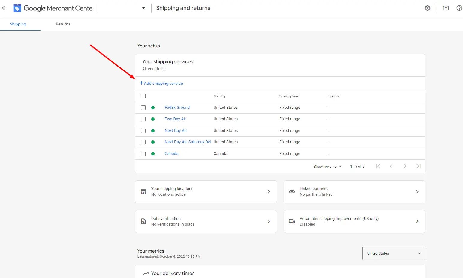 In order to set up account-level shipping settings, you must set up shipping service in your Merchant Center or through the Shipping Settings API. Products or groups of products may be linked to a shipping service [shipping_label] through the shipping label.