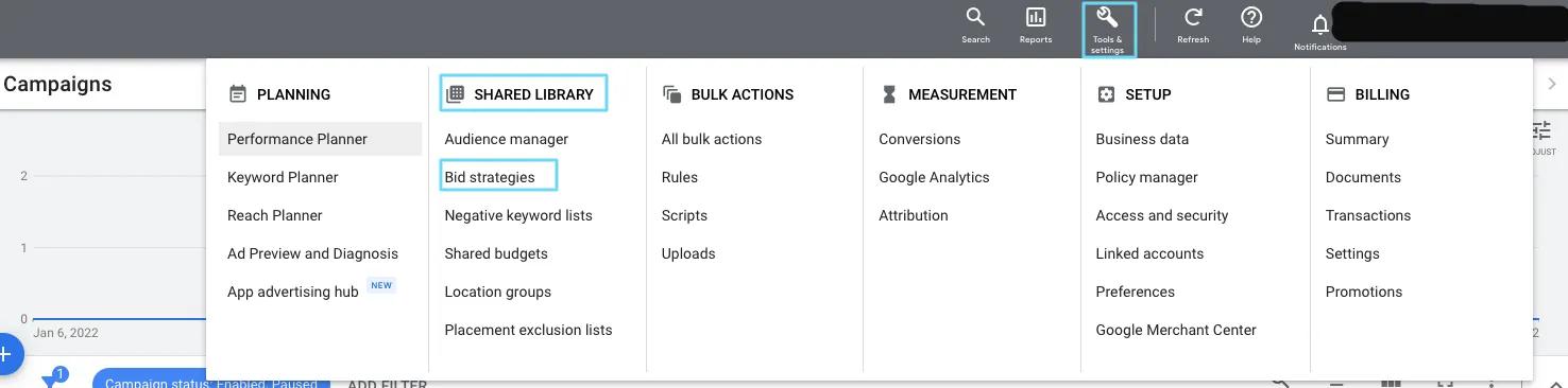 At the top right of the Google Ads menu, select the “Tools and Settings” option. Search for the “Search Library” option and choose “Bid Strategies.”