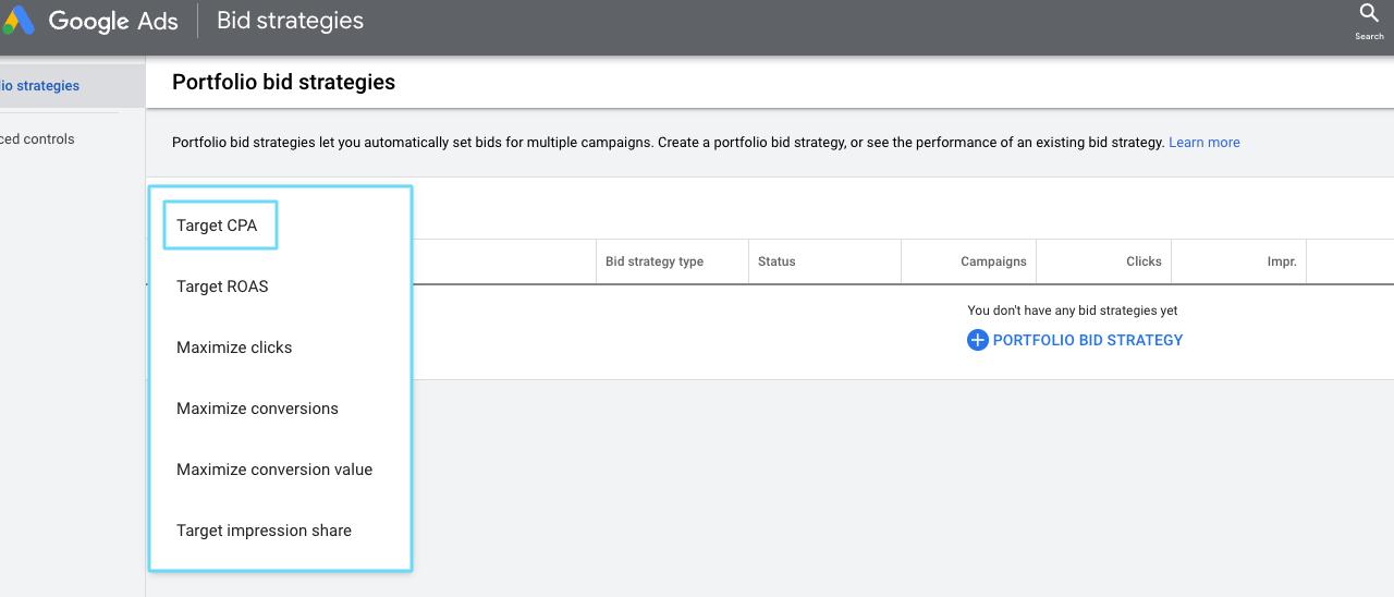 To make a new portfolio bid strategy, click on the blue “+” button. Then, choose which plan you want to use. For this illustration, we will choose the target CPA.
