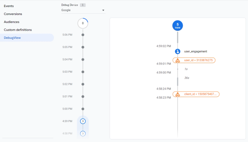 If you select any subsequent event from the list after the user_id item has been highlighted with orange color, just click on its User Properties section on the right side. The user_id property should be listed there, and its value must be the same as the one you saw in the Google Tag Manager preview mode. Moreover, we could find two additional user properties: Client ID and user id dimension. Please look through the Useful Tips section below where we describe why you need them and how they can be sent.