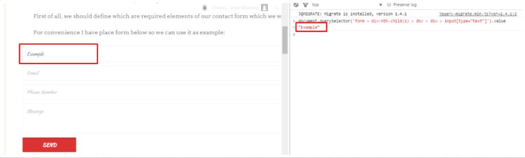 You can check correctness via your Developer Console. To do this, enter any value in the field, take the matching code, and run it in the console. For example, the code for the Name field: