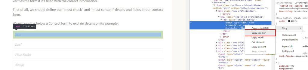 – Define the CSS-selector field. To do this, click on the desired area of the right mouse button and select the item Inspect. In the window that opens, click the right button on the selected item and choose Copy Selector: